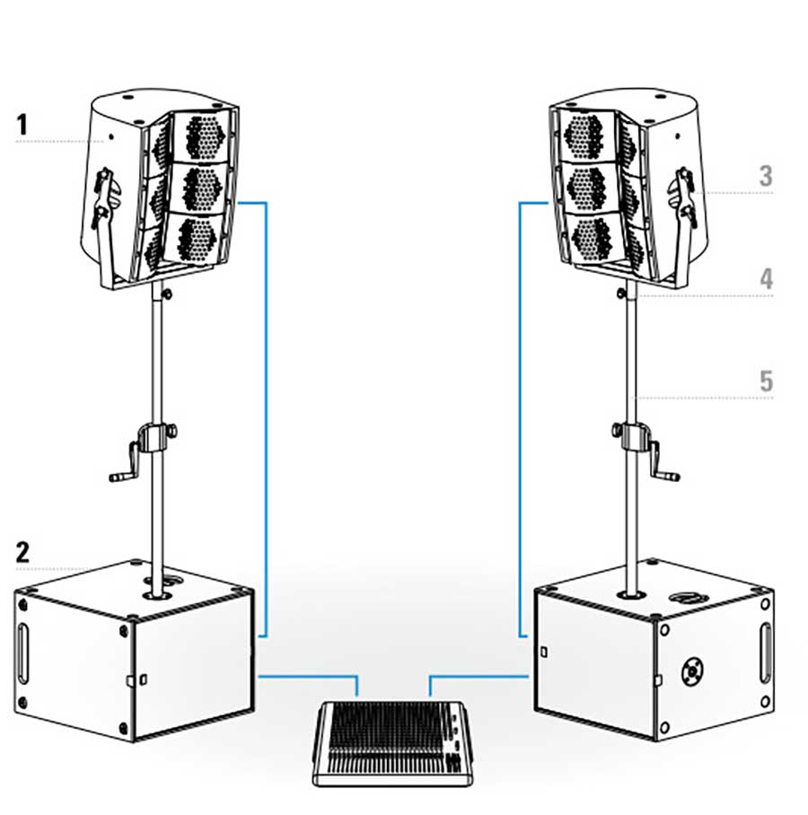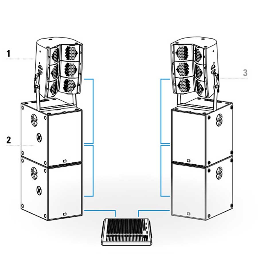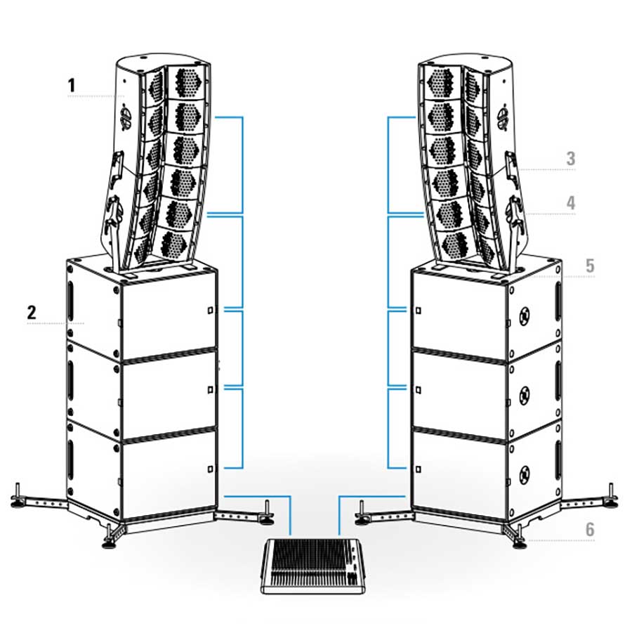 El sistema está compuesto por la caja de medios agudos G3 dp y el subgrave modelo G-SUB dp todos los elementos del sistema son autoamplificados con un total de 11 kw con presiones de hasta 140 dB.