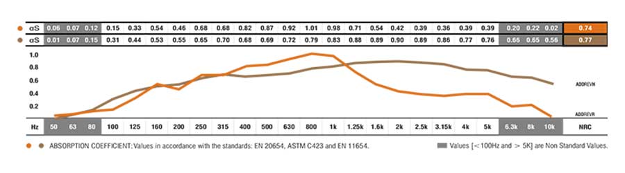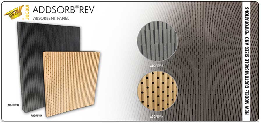 ADDSORB REV es un panel absorbente de densidad media-alta revestido con madera barnizada con estrías en la parte frontal y perforaciones en la parte posterior. En su interior hay una capa absorbente de poliestileno.